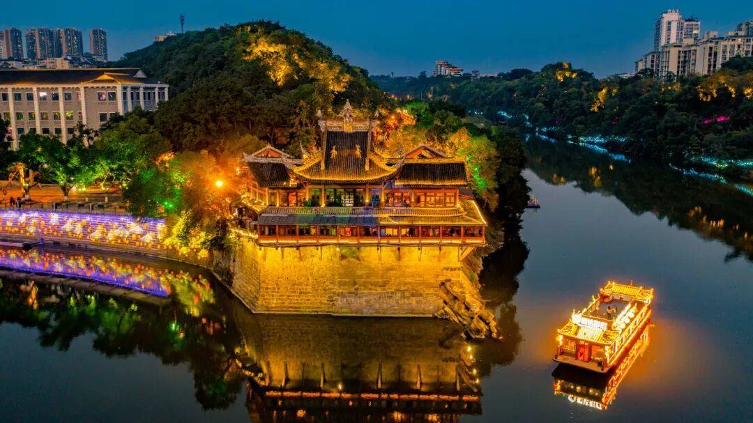 若是想换个角度感受自贡,不妨乘船夜游釜溪。灯影与城市轮廓在水面慢慢铺开,凉风拂面,惬意至极。两岸灯火阑珊,千年盐都在夜色中展现出温柔浪漫的一面。
